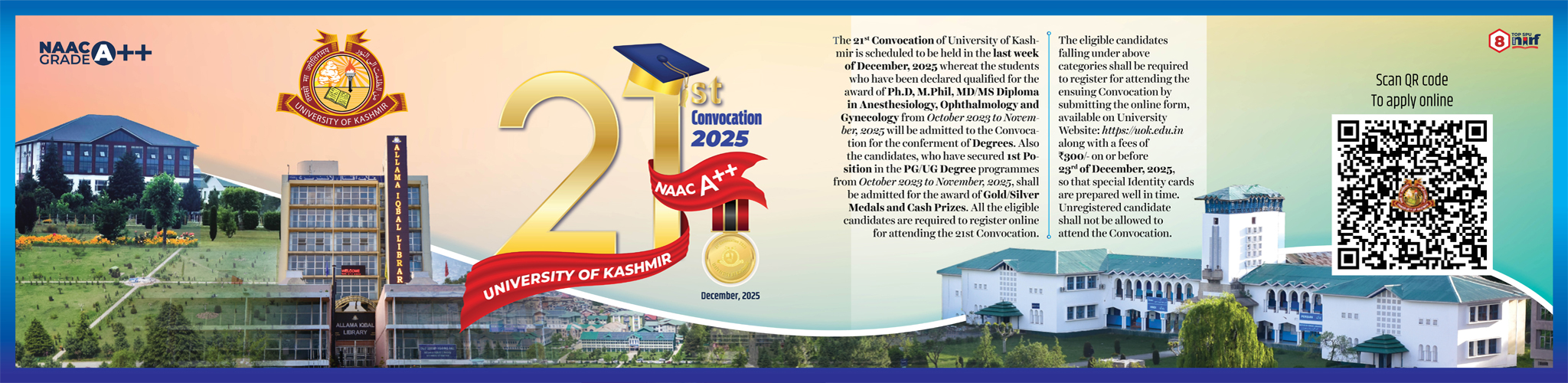 The University of Jammu and Kashmir was founded in the year 1948. In the year 1969 it was bifurcated into two full-fledged Universities: University of Kashmir at Srinagar and University of Jammu at Jammu. The University of Kashmir is situated at Hazratbal in Srinagar. It is flanked by the world famous Dal Lake on its eastern side and Nigeen Lake on the western side. The Main Campus of the University spread over 247 acres of